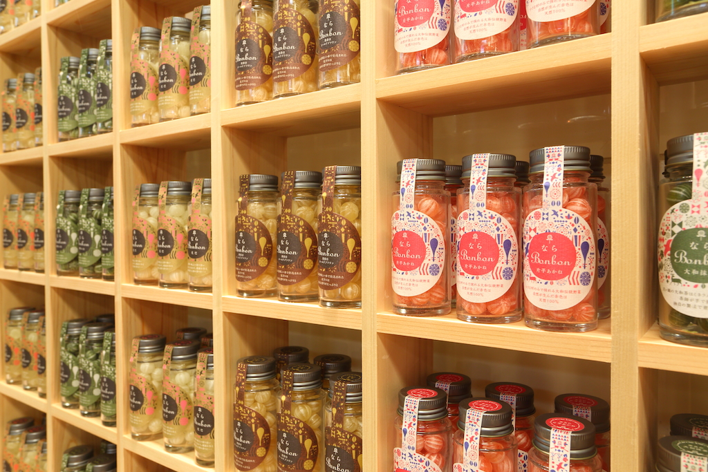 壁には色とりどりの瓶詰めキャンディがズラリ。すべての飴に、奈良の風土と農家の方々が育んだ食材が使われています。