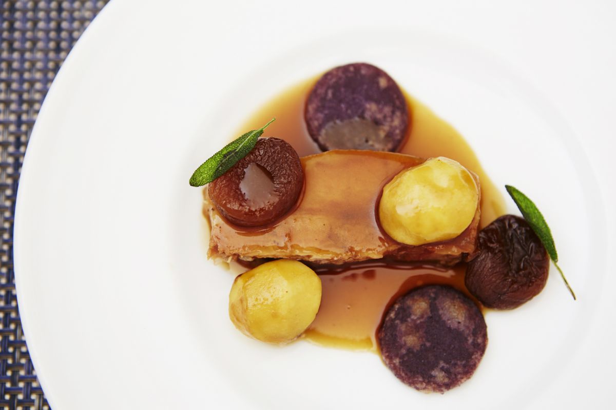 チキンブイヨンとビールで半日かけてコトコト煮込んだお肉は、カトラリーがいらないほどのやわらかさ。ドライアプリコットで甘みをつけた、まろやかな味わいのソースをたっぷり絡めていただきます。付け合わせには、神戸市西区から届いた紫じゃがいもと徳島の栗が季節を演出。