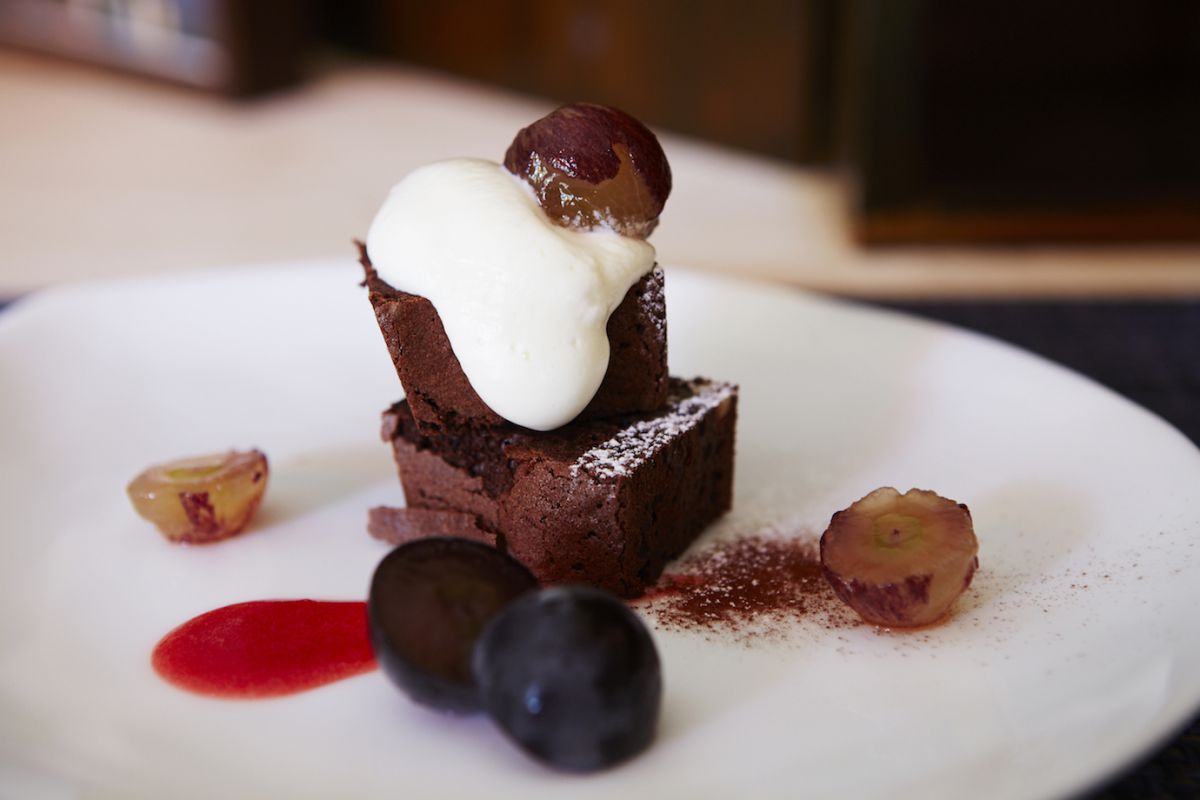 デザートは、くるみとレーズンが入ったガトーショコラ。55%と70%、2種類のクーベルチュールを使用したほろ苦い生地に、ラム酒漬けのレーズンとくるみ。しっとり口どけのよい生地と、長野県から届いた巨峰やフランボワーズソースがよく合います!
