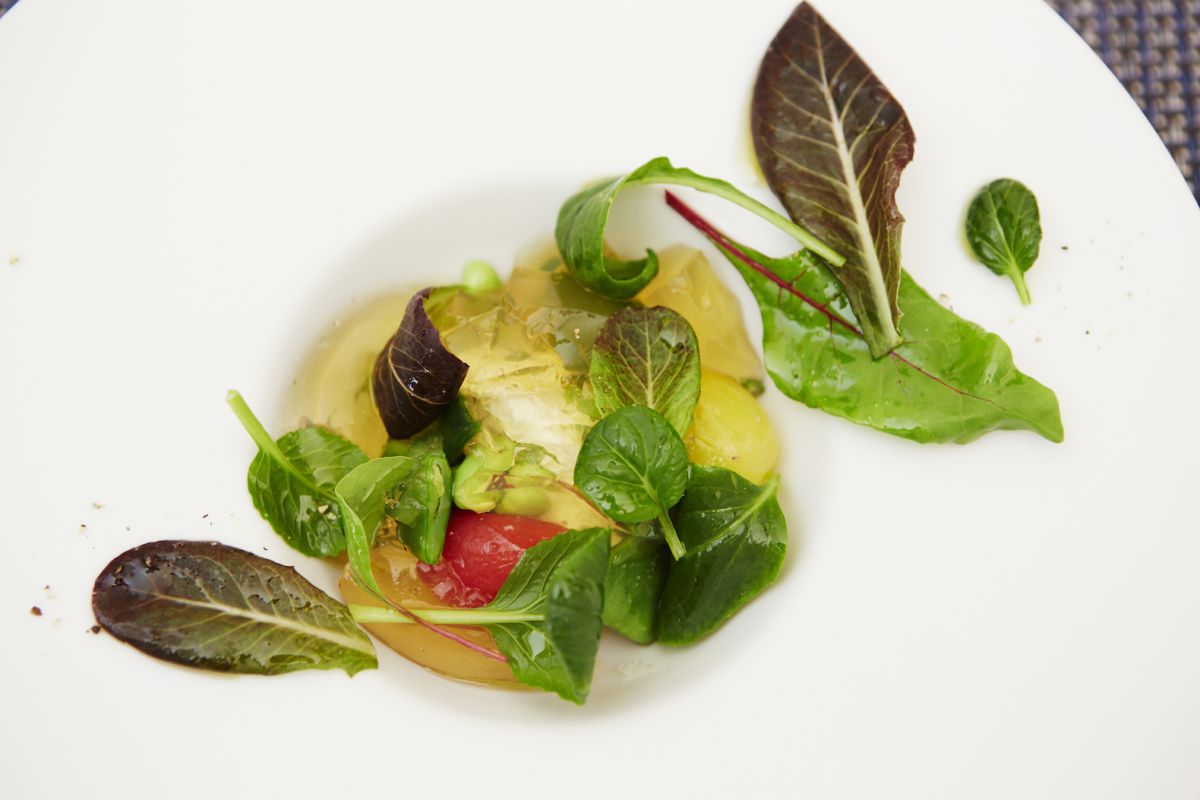 こちらは「リコッタとトマトのサラダ」。潰したトマトをひと晩裏ごししてできた“トマト水”をゼラチンで固めたジュレの中に、実山椒の塩漬けをアクセントにしたリコッタチーズ、信州八幡農園から届く枝豆、モロッコインゲン、神戸市西区のベビーリーフが!鮮やかで生き生きとした一品です。