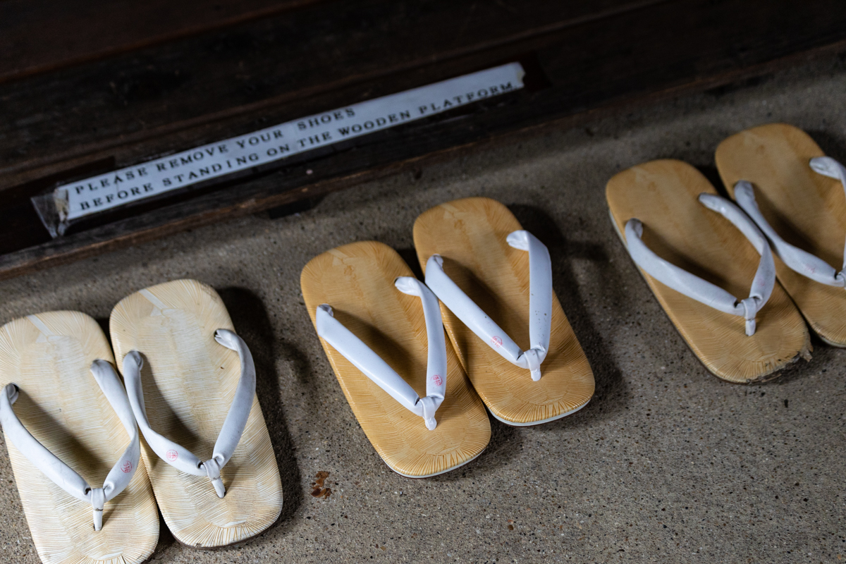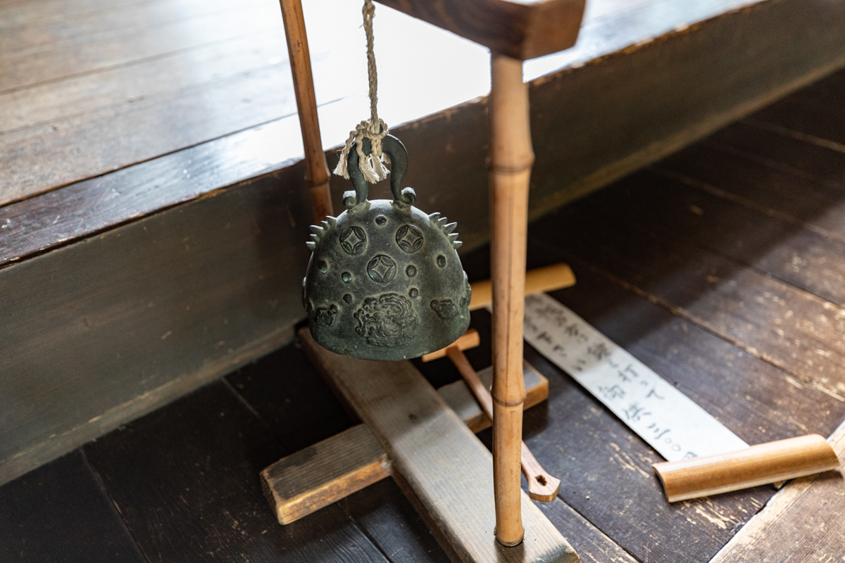 履物を脱いだら、鐘を打って受付の方を呼びます。「御供三百円」と書かれた拝観料は、備え付けの箱の中へ。