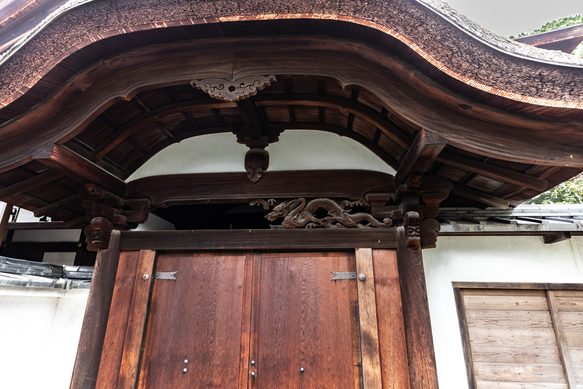こちらは、寛永11年(1634)創建の本堂大玄関。見事な龍の彫刻と、杮葺(こけらぶき)の屋根が見られます。
