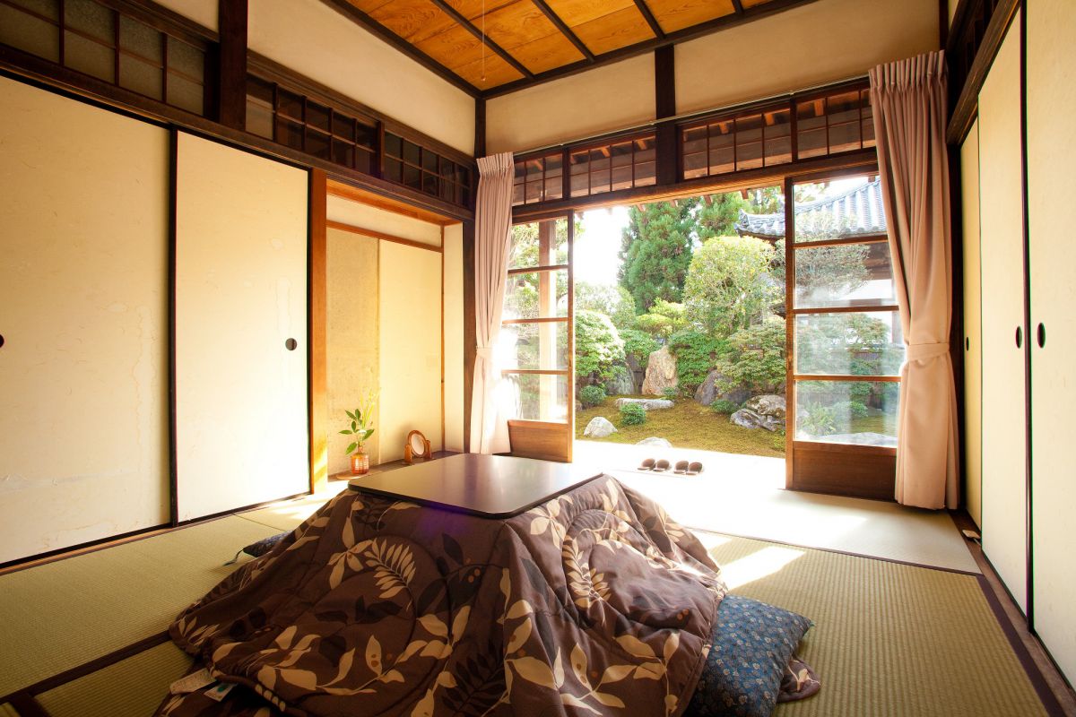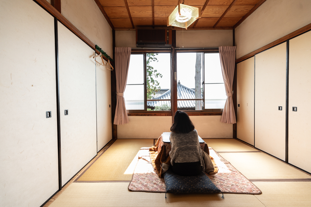 さっそくお部屋へとご案内していただきます。11月中旬頃になると、お部屋にはこたつが準備され、寒い冬の京都を歩いて冷えた体を温めてくれます。