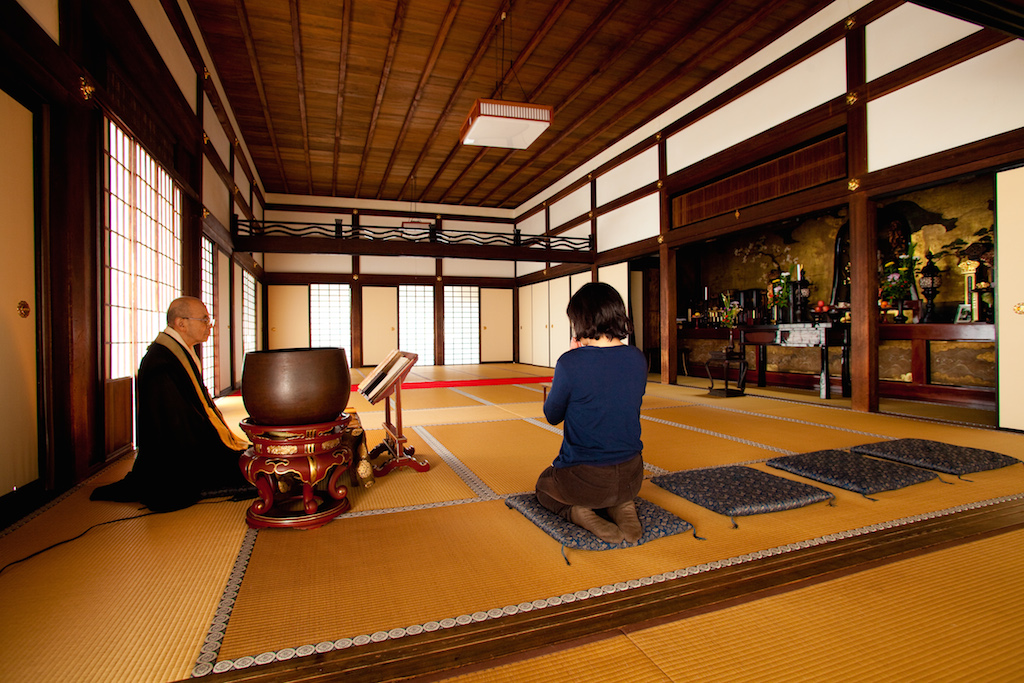 御本尊の前で30分ほど読経されるので、静かに拝聴し、功徳をいただきます。参加はチェックインのときにお願いしておきましょう。