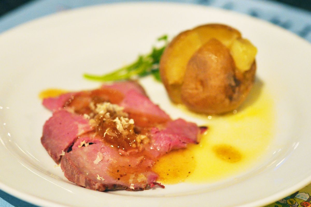 こちらは「ローストビーフ オホーツクフレーバー」。大きなローストビーフの塊をスライスしてくれます。タマネギのうまみたっぷりのソースに、最後に山ワサビを添えて召し上がれ。キタアカリのベイクドポテトは甘くてとろけそう!