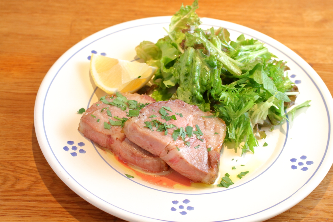 こちらはメインの「豚肩ロース肉の香草オーブン焼き」。オリーブオイルがかかっていて、お好みでレモンをしぼって味わう超シンプルな一品は、豚肉のうまみがダイレクトに楽しめます。