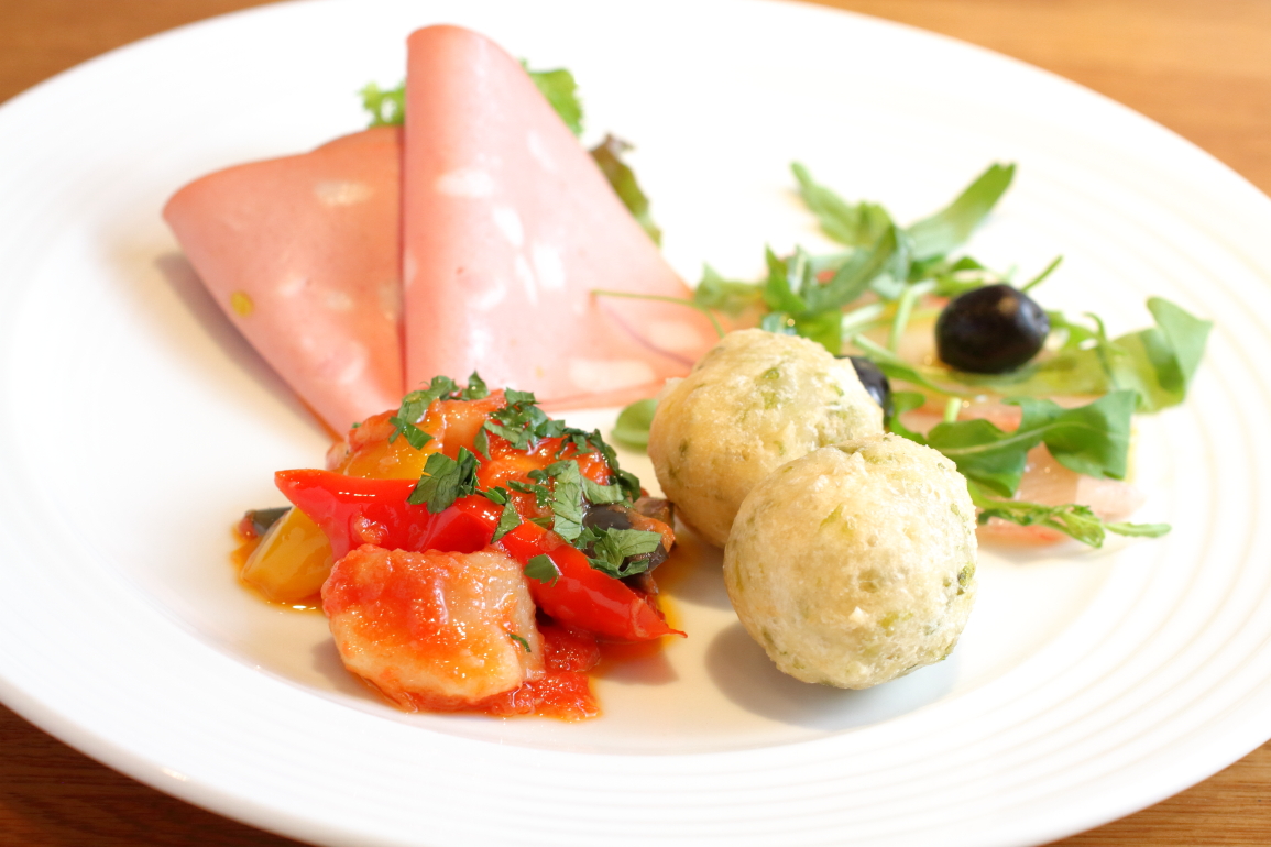 取材日は、素揚げした野菜をトマトソースに漬けたチャンモッタ、小麦生地に青のりを混ぜて揚げたゼッポリーニ、カルパッチョ、ボローニャ産ハムの4品。チャンモッタとゼッポリーニは南イタリアの定番で、このように前菜には必ず南イタリアを感じられる料理を入れているそう。