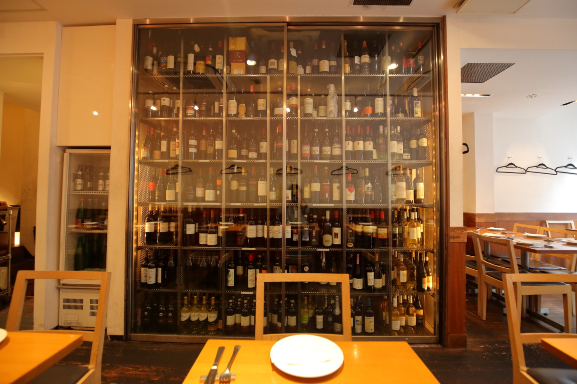 2階席には全面ガラス張りの巨大ワインセラーが!ずらりと並ぶボトルの眺めは壮観です。