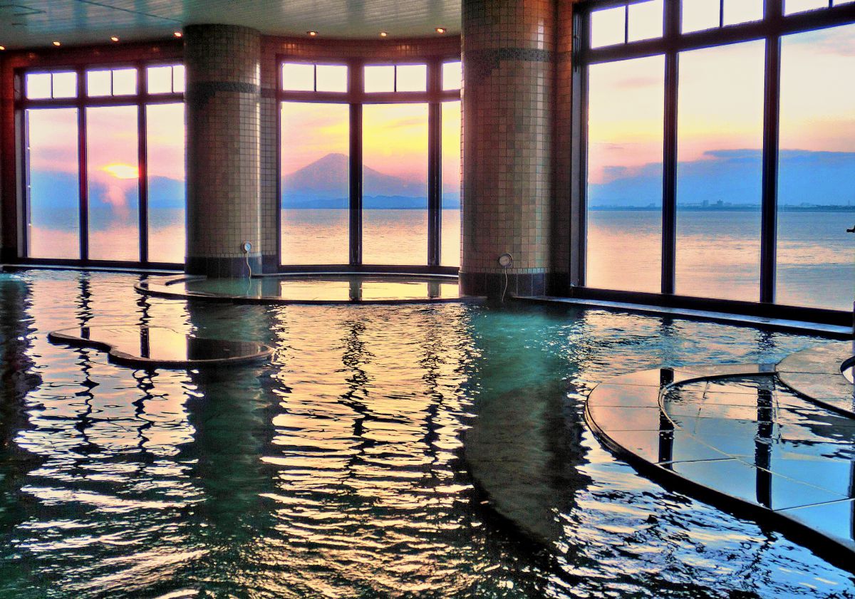 写真は天然温泉の「富士海湯」。こちらも海の向こうに富士山を見ながら入浴できます。冬の澄んだ空気の中では、遠くに見える富士山もくっきりと浮かびあがり、気持ちのいい湯浴みを楽しめます。