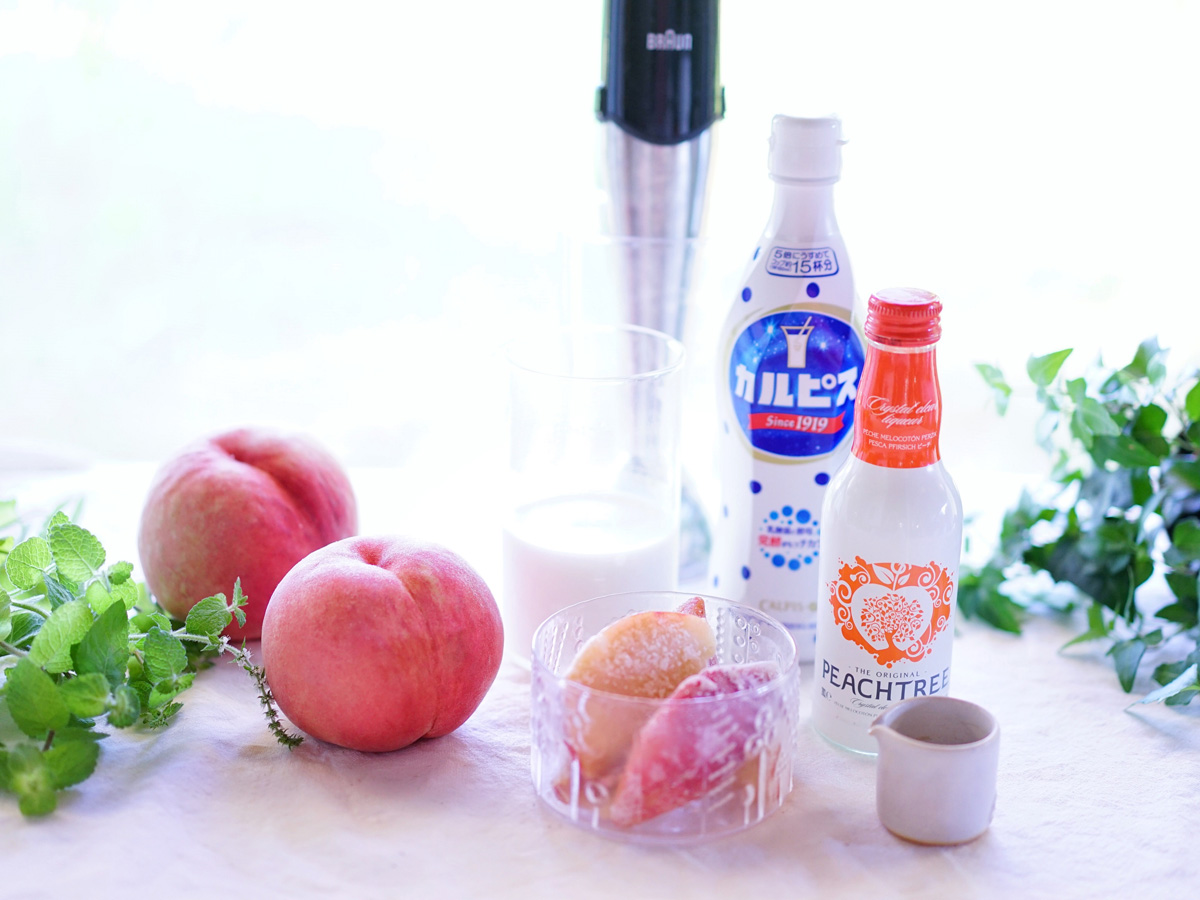 桃は皮ごと冷凍します。あとは、材料をカップに入れ、ハンドブレンダー等で混ぜるだけ。優しく儚げな桃の甘さを引き立てるピーチリキュールは、ぜひ準備してほしい材料です。