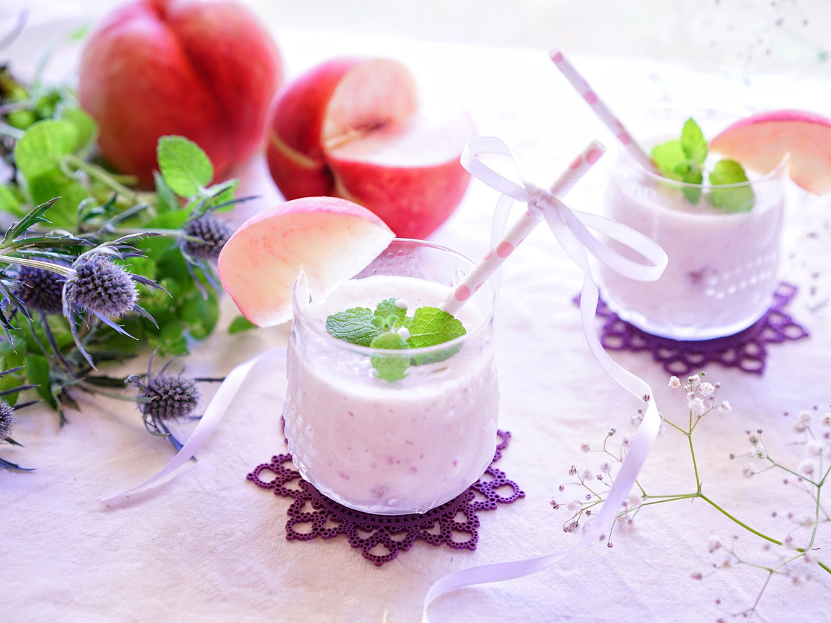 皮ごと冷凍した桃をミキサーにかけることで、桃そのものを余すことなく味わうことができます。淡いピンクがかわいくて眺めていたくなりますが、冷たいうちに飲んでくださいね。