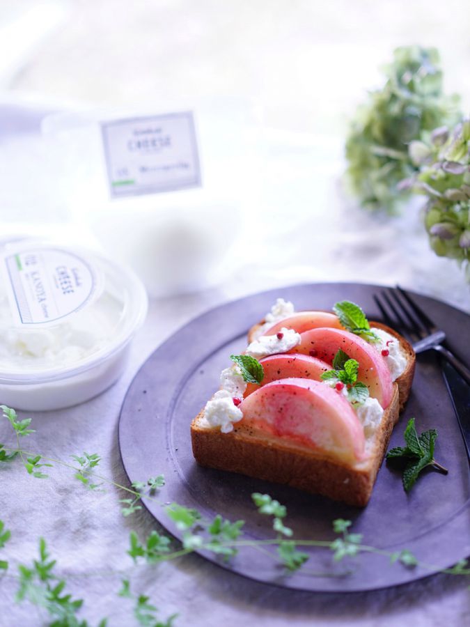 桃と好相性なチーズ。半月切りにした桃をシロップでマリネして、クリームチーズとともに、トーストしたパンにのせて、オープンサンドに。