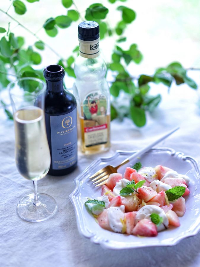 こちらも定番になりつつある、桃モッツァレラ。せっかくなら、とびきりおいしいモッツァレラを準備して。包丁で切るのではなく、指でちぎるのがポイントです。ビネガーと千切りにしたレモンの皮、黒胡椒にオリーブオイル。和えるだけで、ワインにぴったりな一品の完成です。