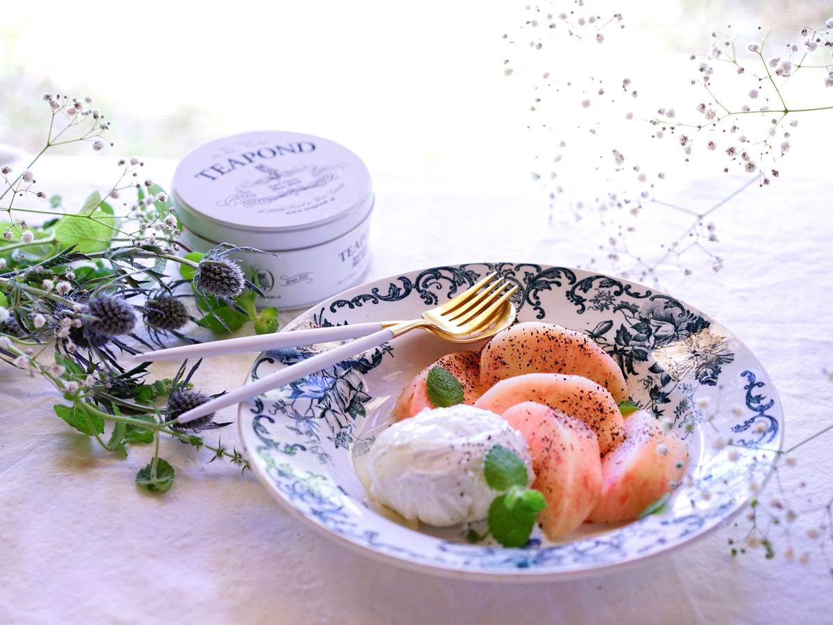 SNSで流行中の、桃のアールグレイマリネ。アールグレイの茶葉を指ですり合わせながらふりかけ、お砂糖もぱらぱらと。驚くほどぴったりの組み合わせは目から鱗です。マスカルポーネチーズや、水切りヨーグルトで作ったクレームダンジュを添えれば、立派なデザートに。