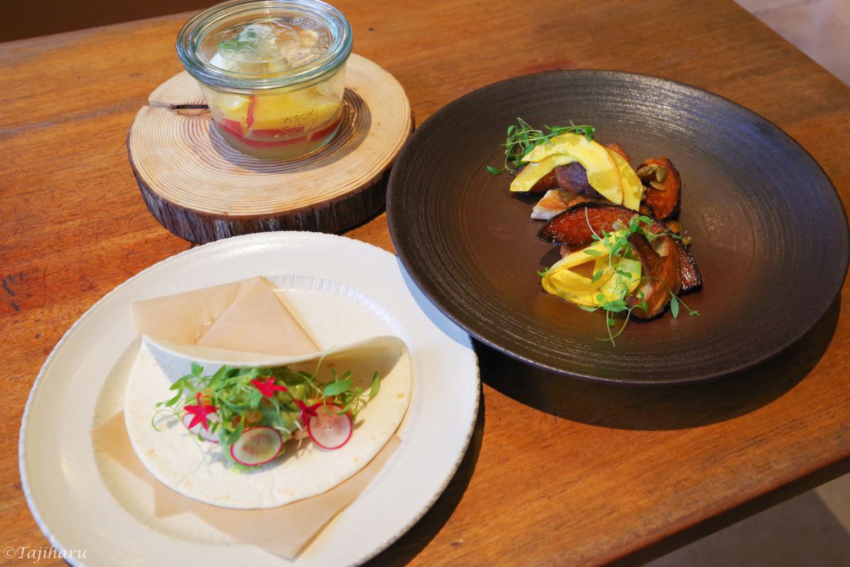 前菜は秋鮭のタコス(左下)、メインは地鶏のソテーと椎茸 キャラメル南瓜(右)、デザートはサツマイモのコンポート はちみつレモンのソルベ(左上)。こちらにスープとパンも付くので大満足のボリュームです。