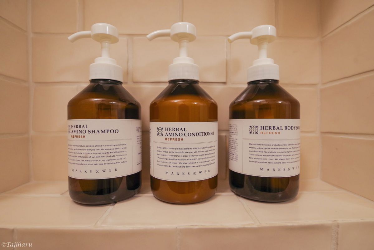 宿泊する上で大事なバスアメニティ。よくグレードの高い客室のみブランドアメニティが置いてあるホテルが多いですが、「CLASKA」は、全室オーガニック製品で人気の「MARKS&WEB(マークスアンドウェブ)」のものが取り揃えられています。