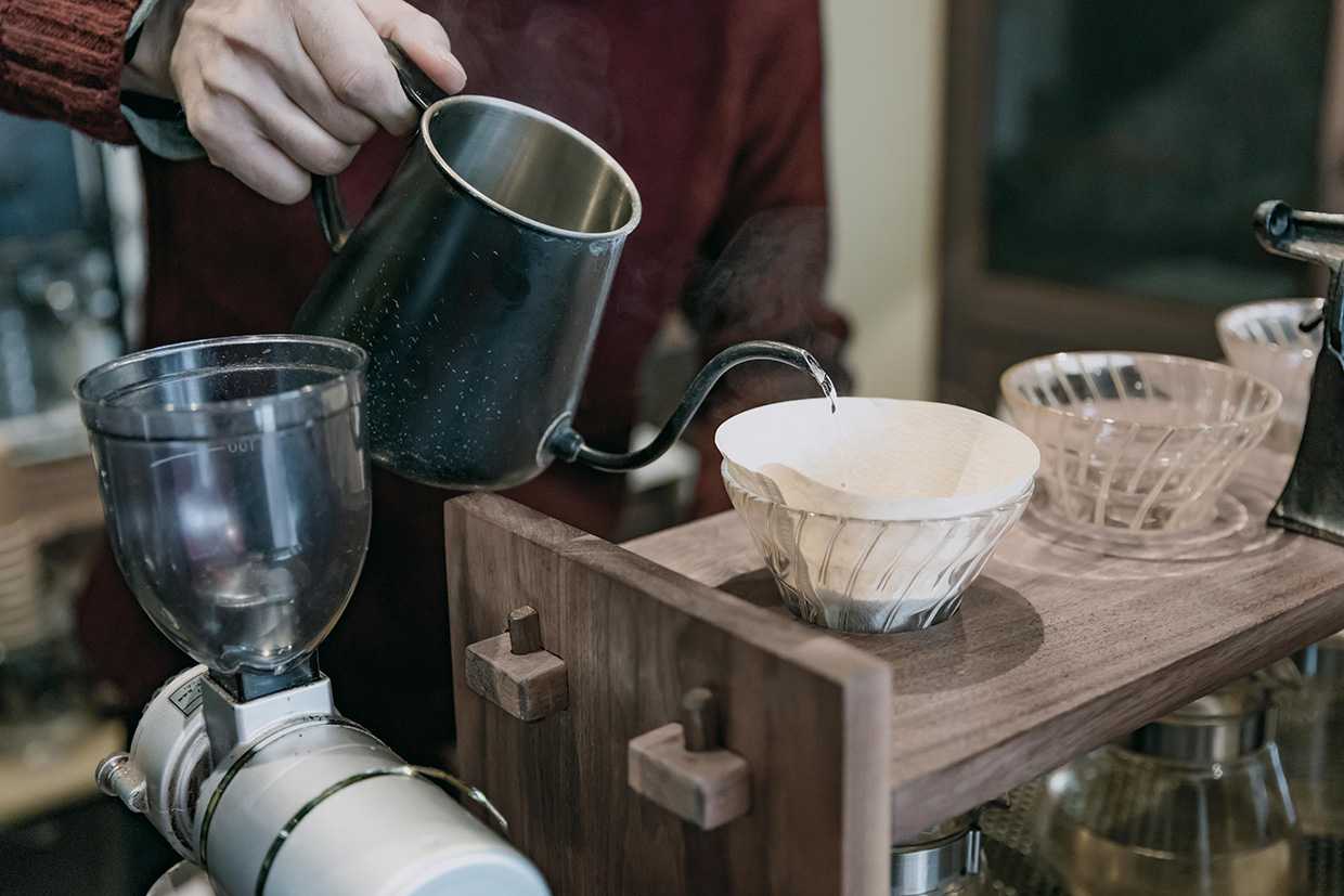 好みの味を伝えると、おすすめの豆を選んでくれる。オーダーの後、その場で豆を挽いて一杯ずつハンドドリップで淹れる珈琲。注がれる細いお湯と手作業を目の当たりにしながら、立つ香りにただただうっとり。