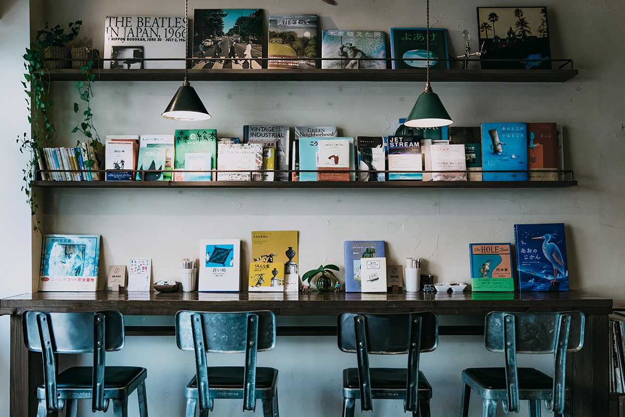壁面に本棚が設置されたカウンターに4席。マスターの甲斐さんがセレクトした絵本や小説、雑誌なども置いてある。