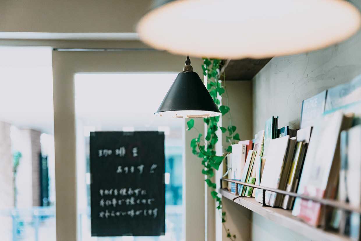 壁一面の本棚と大きな黒板、インダストリアルな店内