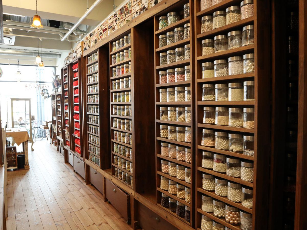 壁一面に並ぶパーツは圧巻!コットンパールだけでもこんなにたくさん、色や大きさから細かく選ぶことができます。