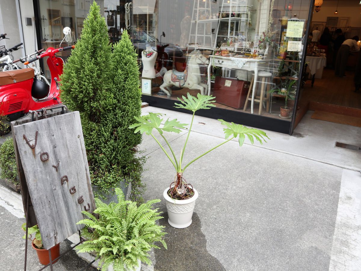 おしゃれなディスプレイの店前には、手作りの素朴な看板があります。アクセサリーのパーツで描かれたようなお店のロゴがかわいらしいです。