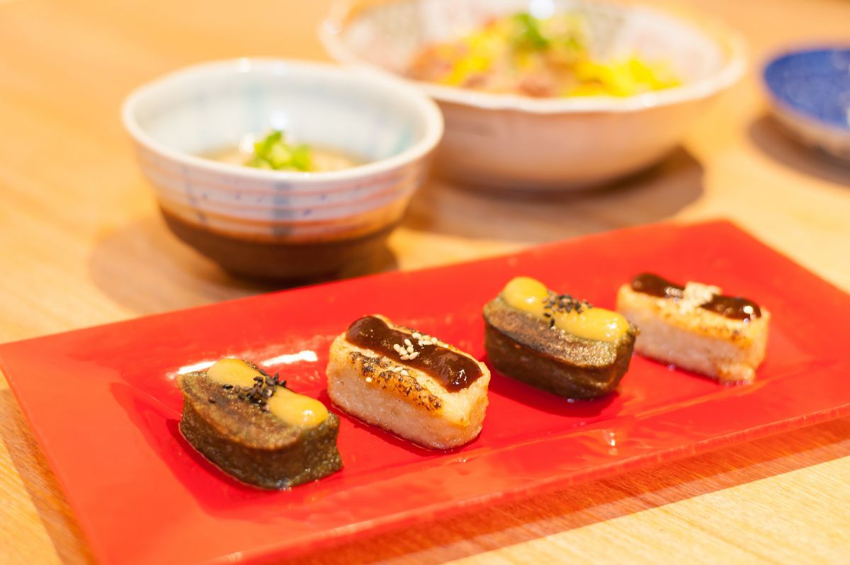 「麩嘉さんとこの生麩の二色田楽」では、国内で最も古い専門店「麩嘉(ふうか)」の京生麩を味わうことができます。まるでお餅のような、ふわふわとした食感がたまりません。