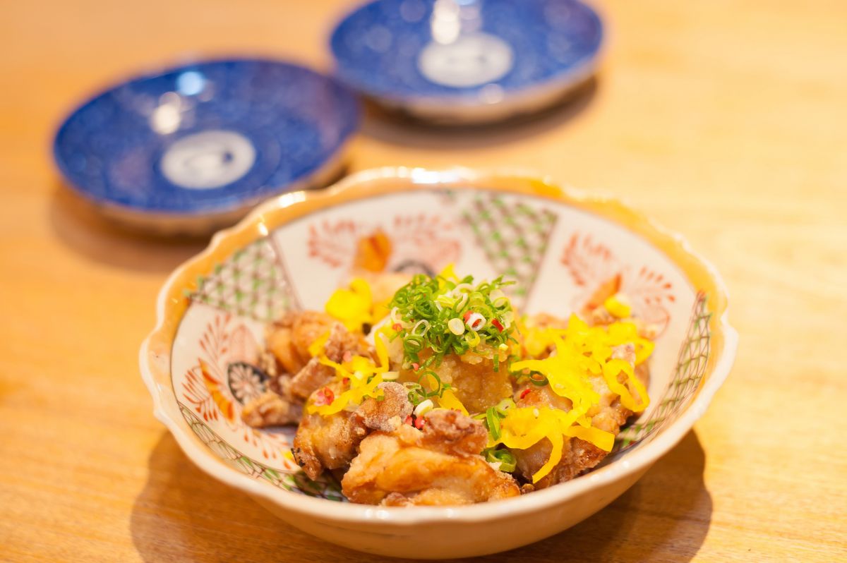 「若鶏の唐揚げのおろしぽん酢 べったら和え」は、若鶏の唐揚げに、京つけもの店「打田漬物」の「べったら」をトッピングした一品。パリパリとした食感が楽しく、お酒が進みます。