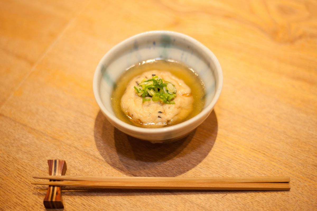 まずは、付き出しの「飛竜頭(ひろうす)」。明治30年創業の老舗であり、京都を中心に多くのファンを抱える豆腐店「とようけ屋山本」から取り寄せたもの。飛竜頭は京言葉で、一般的には「がんもどき」にあたるそう。油で揚げてあるものの、しつこさはまったくなく、上質な味わいが楽しめます。