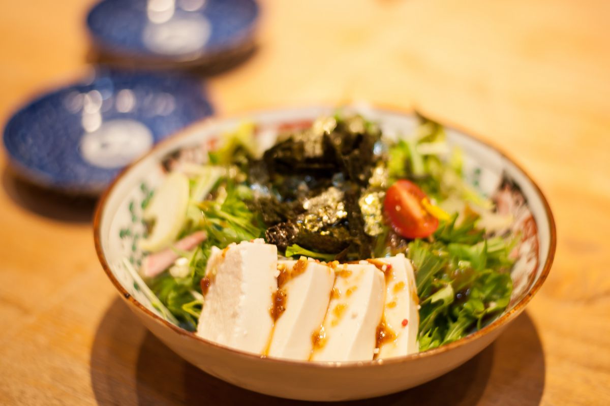 「とようけやさんとこのお豆富と京水菜サラダ」は、飛竜頭と同じく「とようけ屋山本」の豆腐が使われています。ややこってりとした舌ざわりで、豆の風味が豊かに感じられることが特徴。一般的な豆腐とはまったく異なる味わいに驚かされます。