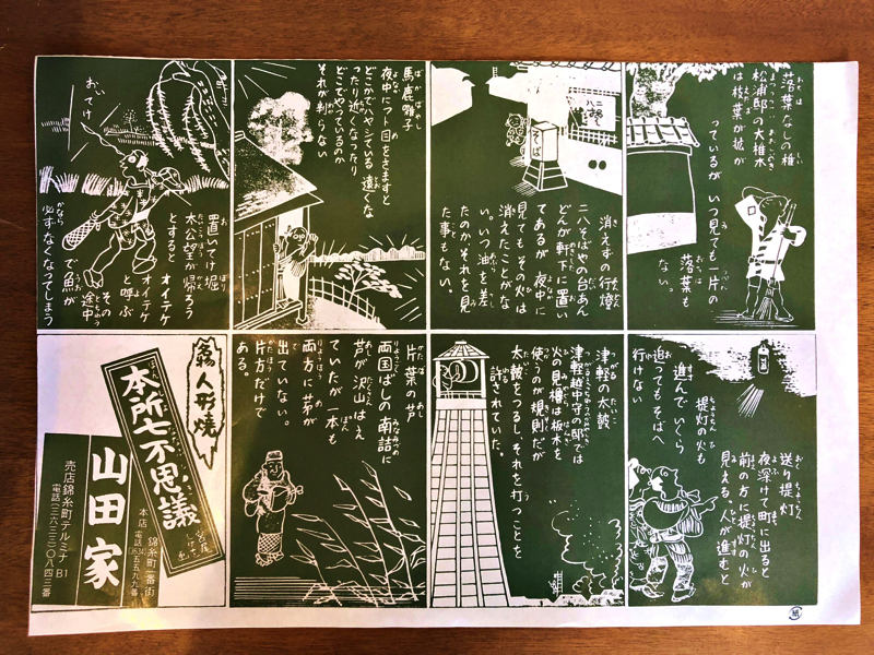 「山田家」の人形焼は錦糸町に古くから伝わる本所七不思議をもとに作られていて、たぬきをはじめ、太鼓やもみじなどさまざまな型がありました。その小話がプリントされている包装紙を見て、宮部さんが作品を書かれたのだとか!