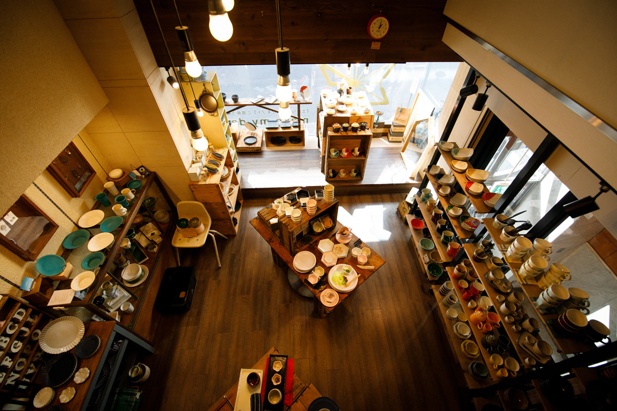 吹き抜けの店内には約800点の焼き物が並んでいます。そのほとんどが、店のオリジナルで、オーナーの岡上さんがデザインしています。岡上さんは店を始める前から焼き物が好きで、全国各地の窯元へ足を運んでいたそう。瀬戸焼をはじめ、常滑焼や美濃焼など、東海エリアには多くの焼き物産地がありますが、魅力を発信できる場所が少ないと考え、自ら専門店を開くことにしたのだといいます。