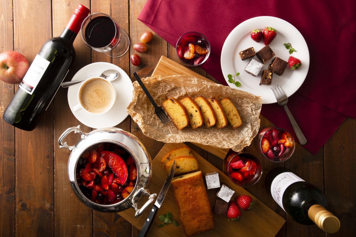 グリューワインをイメージした「フルーツ赤ワインコンポート」、濃厚な味わいのブラウニーなどお酒を使ったオトナスイーツも登場。イチゴショートケーキやりんごシナモンパイなど定番スイーツもホテル仕様です!