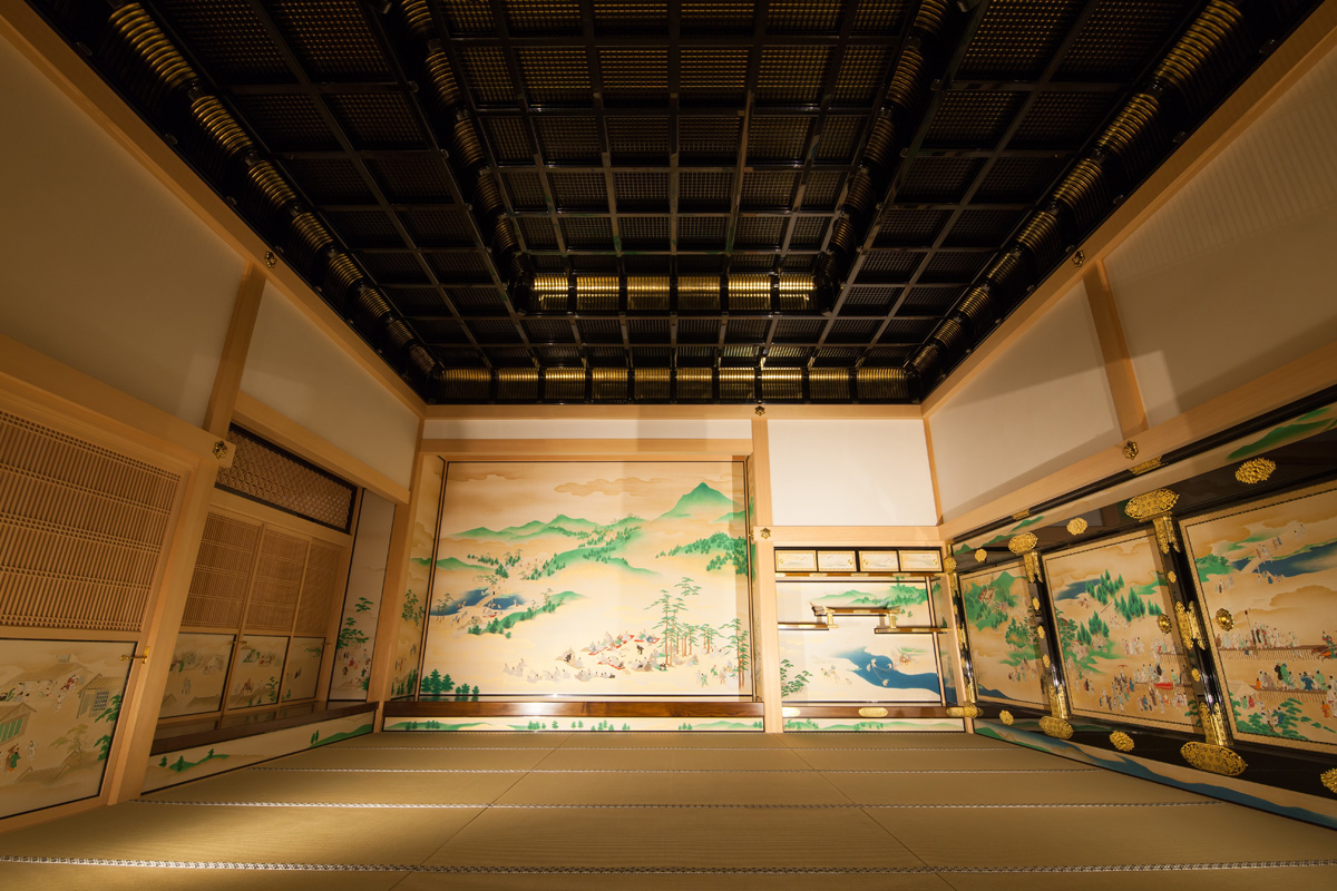 本丸御殿は奥に進むにつれ、パブリックからプライベートな空間となります。すなわち、奥へ行けば行くほど、位の高い人が使う=豪華なしつらいになっているのです。例えば、天井は格式の低い棹縁(さおぶち)天井から格式の高い格天井(ごうてんじょう)となり、さらに格縁が黒漆塗に、天井板は金箔が押され…と次第に豪華絢爛に。狩野派による障壁画も、「走獣 < 花鳥 < 人物 < 山水」の順番で格が高くなるため、部屋ごとに画題が異なるのがわかると思います。