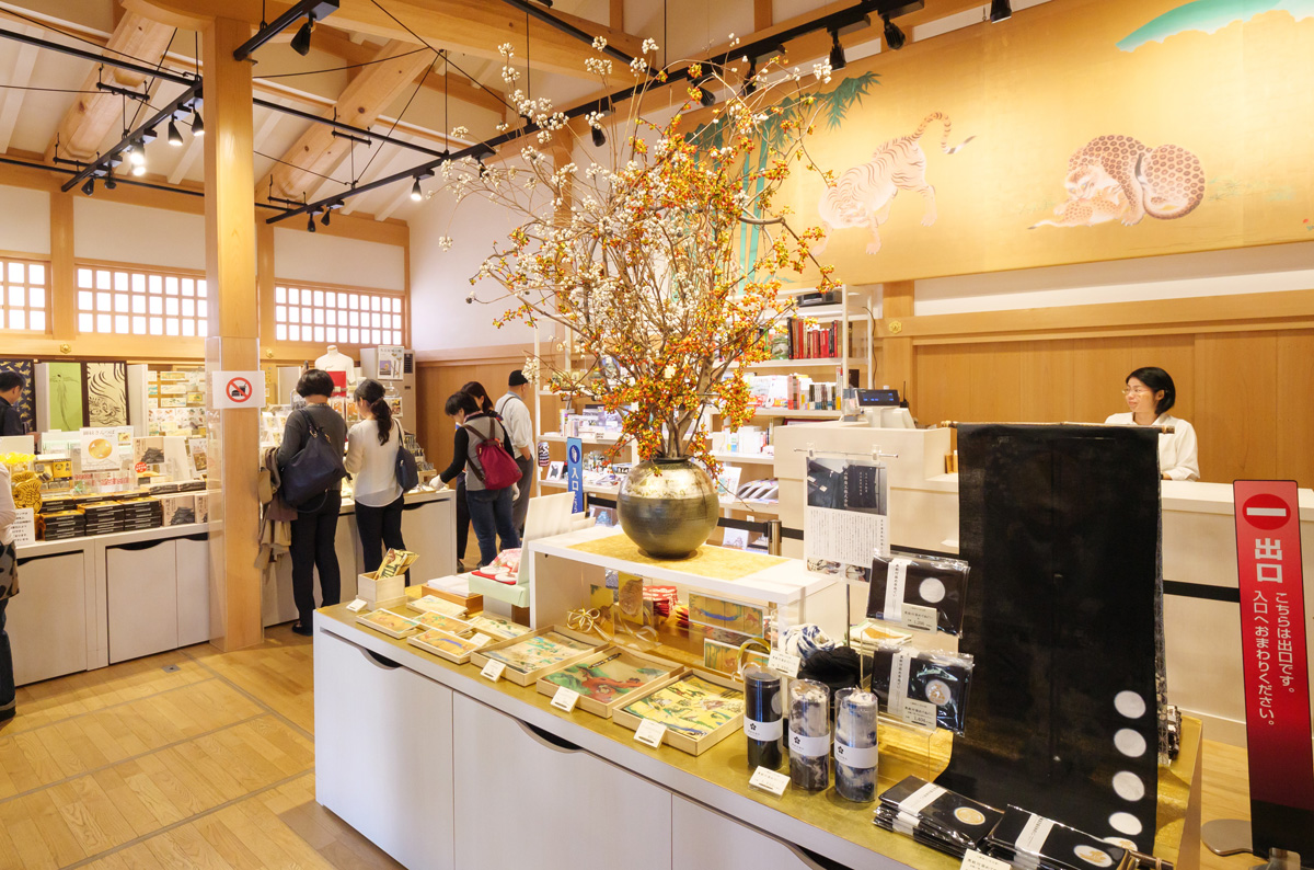 本丸御殿の上台所にあたる場所には、ミュージアムショップがあります。本丸御殿の障壁画が描かれたクリアファイルや一筆箋など、名古屋城らしい金色のグッズを豊富にラインナップ。名古屋の伝統的な技法で染めた布に、金のシャチホコをあしらった「黒紋付染めてぬぐい」(1404円)といった、ミュージアムショップオリジナルの商品も見逃せません。