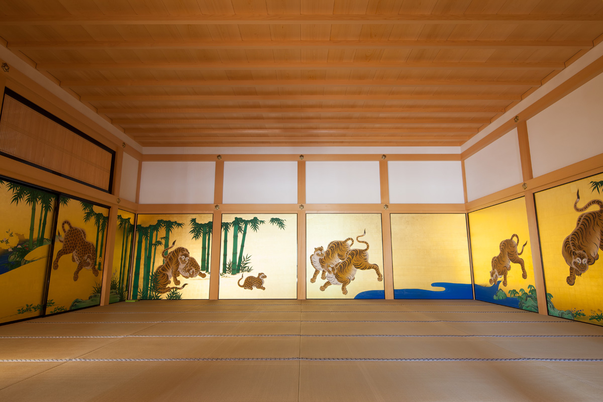 本丸御殿の忠実な復元は建物だけではありません。襖絵や床の間絵、天井絵もまた、緻密に復元模写されているのです。かつての描画の工程の調査研究を進め、絵の具も当時と変わらぬ岩絵の具を用いています。しかも、それら障壁画のすべてが、ガラスケースの展示室ではなく、すぐ目の前に、隔てなく見ることができるんです!