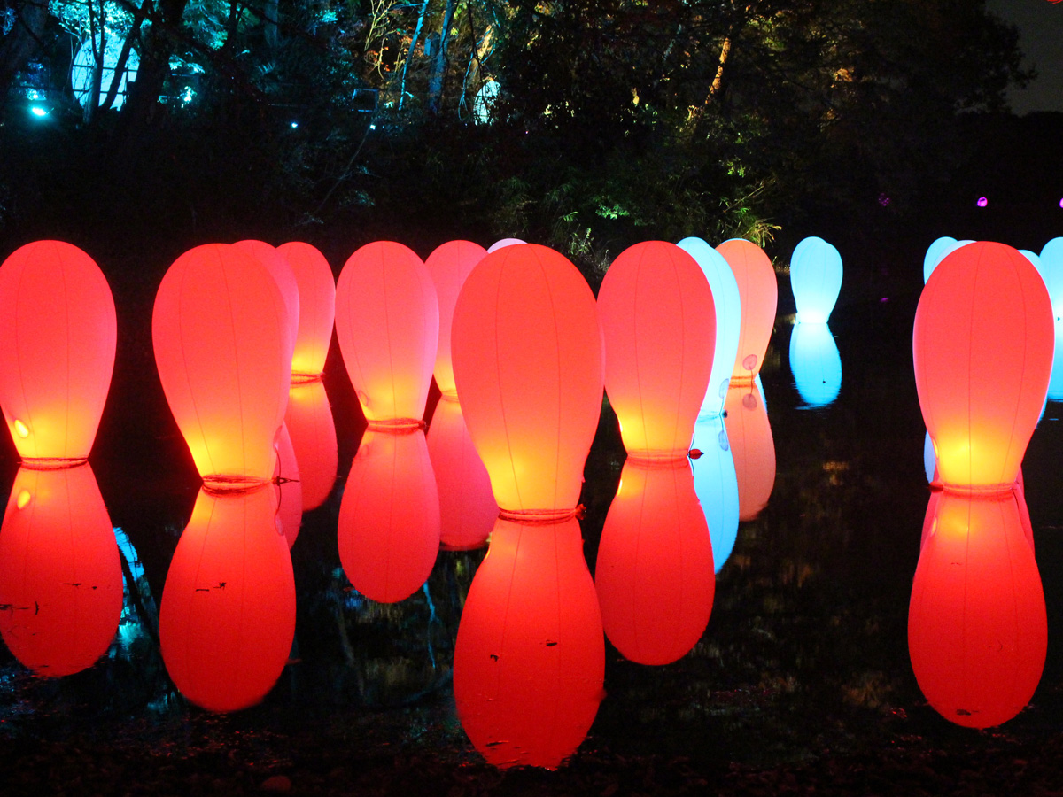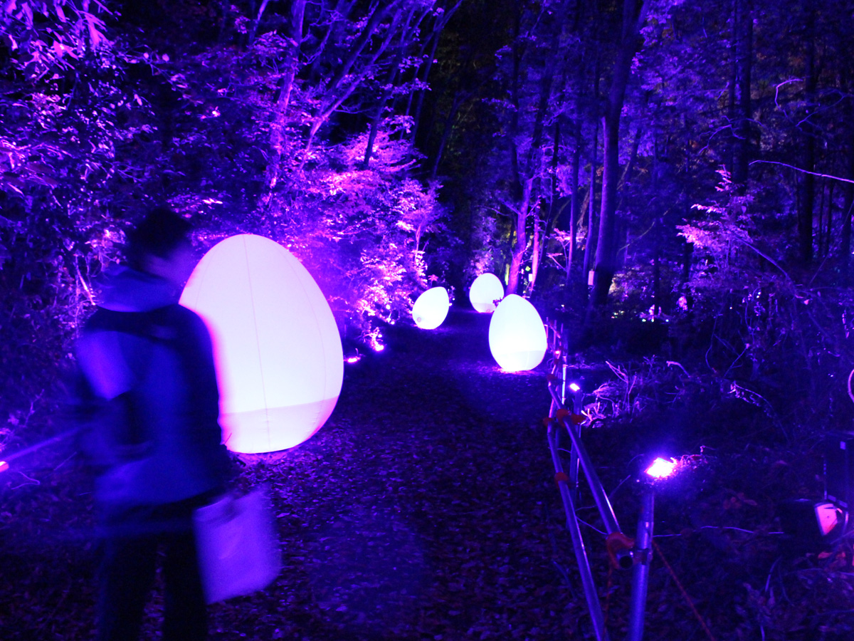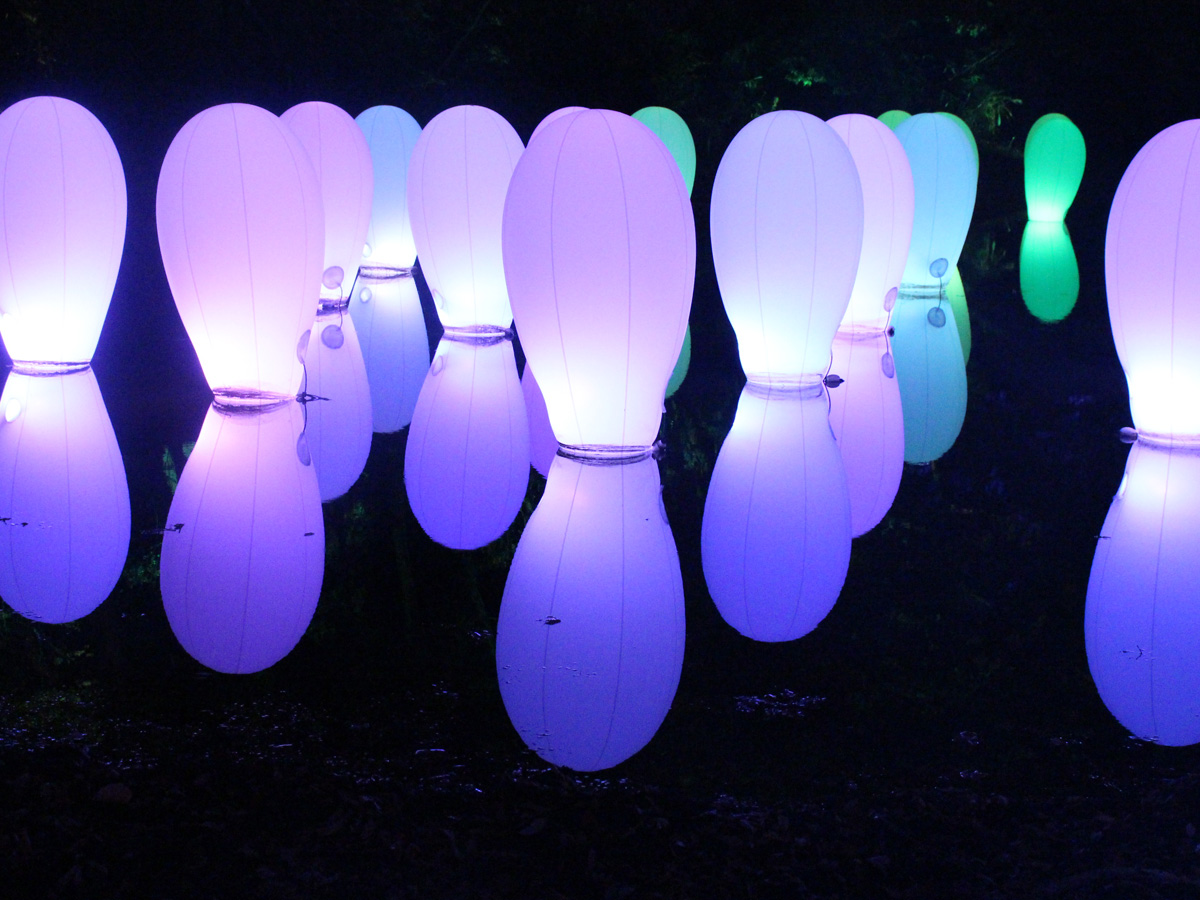 次々と色を変える球体、ライトアップされた木々、会場中に流れる不思議な音楽…湖畔沿いの森の中を歩いていると、まるでおとぎ話の中に迷い込んでしまったかのような気分に。今にも、「ムーミン」の世界に出てくるような、不思議な生き物たちがひょっこりと現れそう。