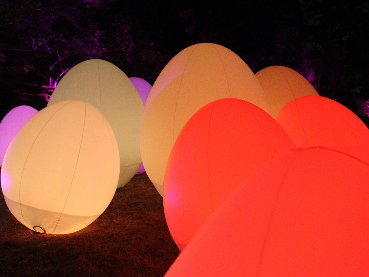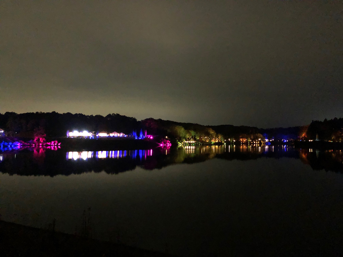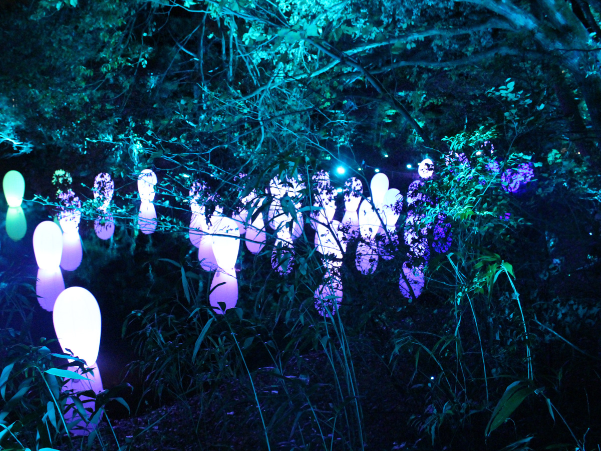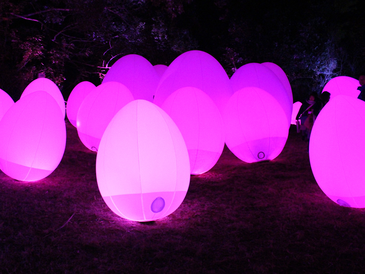 次々と色を変える球体、ライトアップされた木々、会場中に流れる不思議な音楽…湖畔沿いの森の中を歩いていると、まるでおとぎ話の中に迷い込んでしまったかのような気分に。今にも、「ムーミン」の世界に出てくるような、不思議な生き物たちがひょっこりと現れそう。