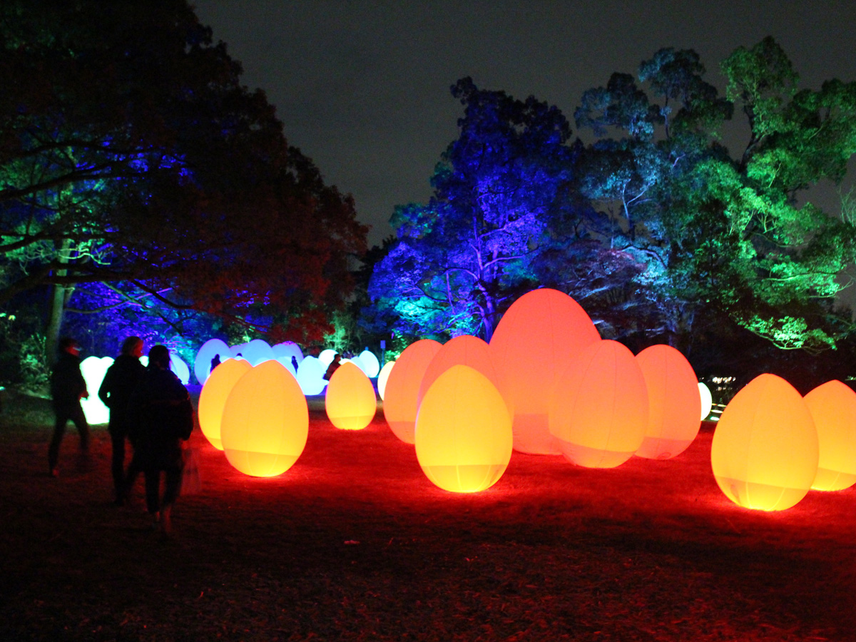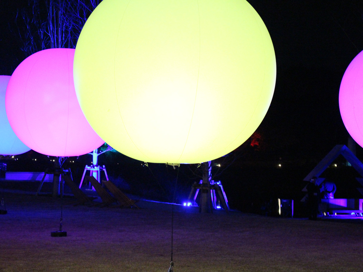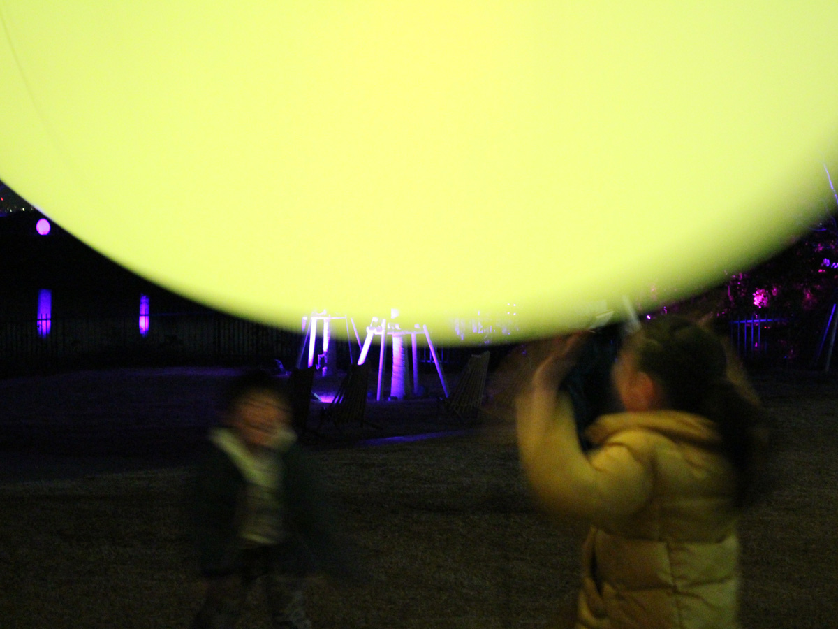 入口からまっすぐ左手に進んだ「イベント広場」にある『浮遊する、呼応する球体』。浮かび上がった球体を揺らしみると、音とともに色が変化。すると、それに呼応するように周囲の球体も同じ色に変わっていきます。その様子は、まるで球体ひとつひとつが生きているかのよう。
