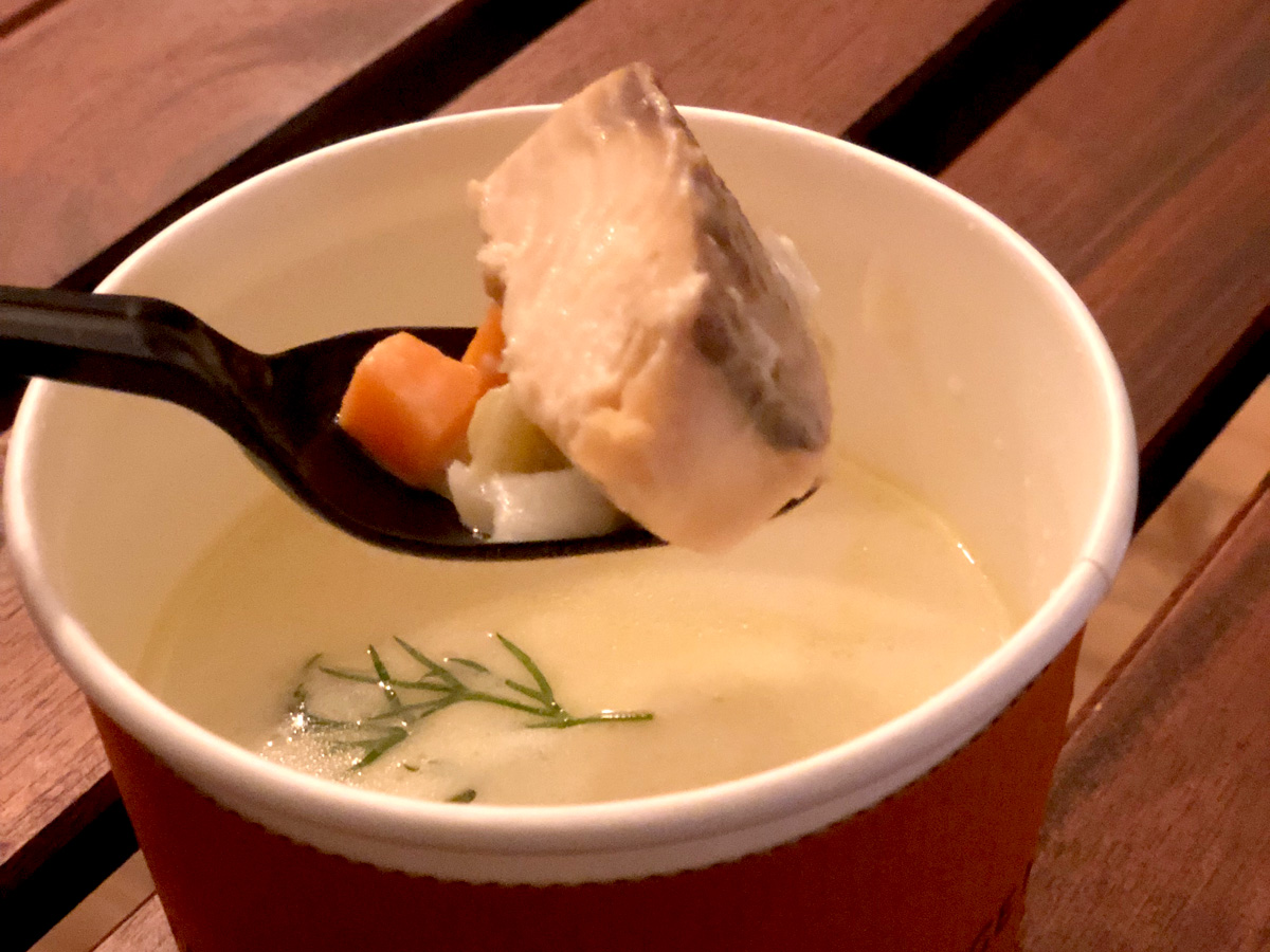 屋外アート鑑賞の後は、やはり温かいメニューが嬉しいですよね。こちらは「Lohikeitto(ロヒケイット)」という、フィンランドではポピュラーな“おふくろの味”的なサーモンのクリームスープ。クリーミーでほっとする味です。