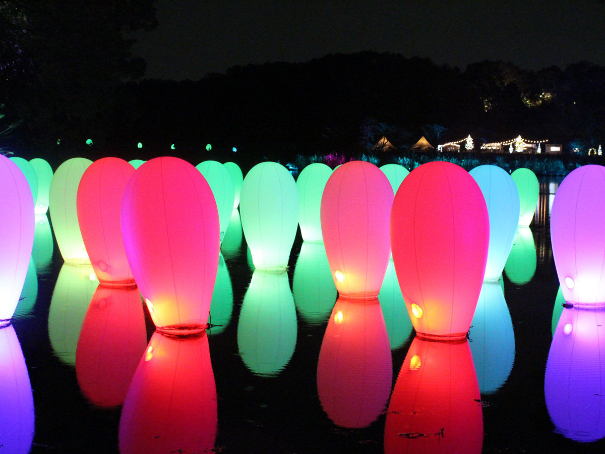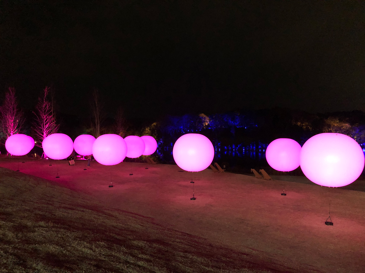「チームラボ 森と湖の光の祭」では、「メッツァビレッジ」のある宮沢湖のほぼ半周をぐるりと囲むように、色とりどりに発光する球体が設置されています。全長2km以上の今作品は、チームラボでも一番規模の大きいものとのこと。