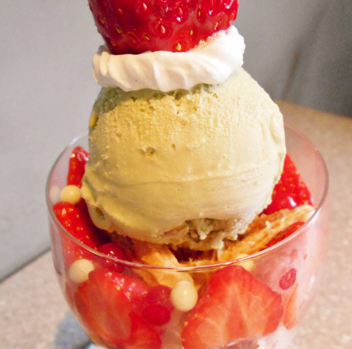ひと口食べると、主役であるイチゴの酸味を、生クリームの控えめな甘さや、ピスタチオアイスの濃厚な味わい、パイやナッツのサクサク食感が引き立てます!さまざまな素材のおいしさがきらめく、まさに宝石のパフェです。