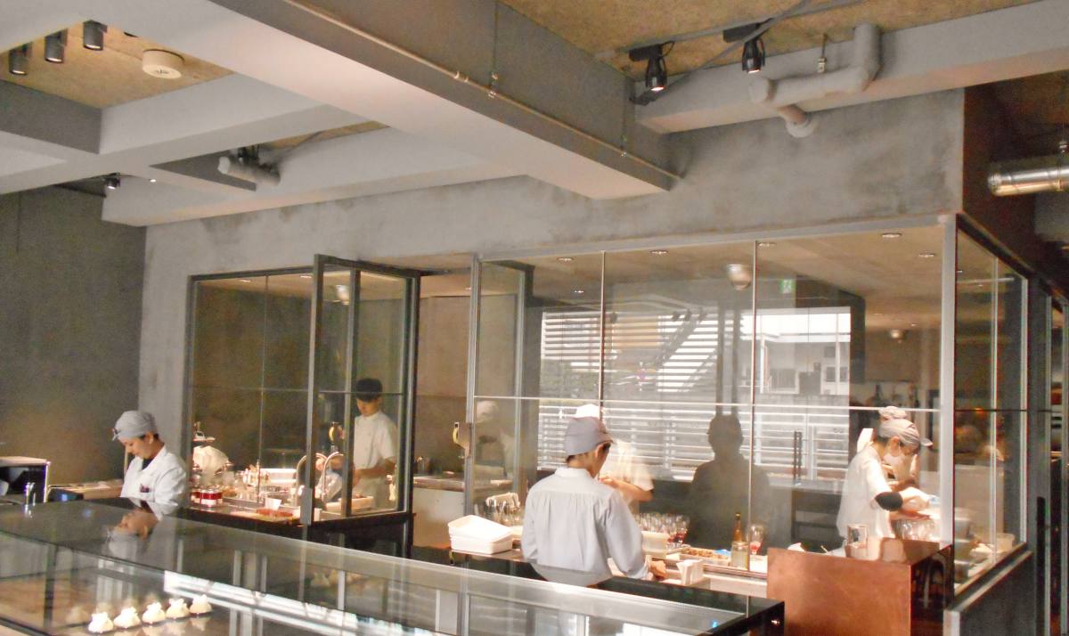 カウンター越しの工房にはたくさんのスタッフさんの姿が。美しいスイーツたちが生み出されていく様子を目の前で見ることができます。