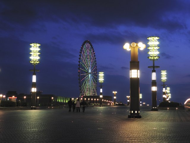 個性的な照明が並ぶ広~い橋から、大観覧車のイルミネーションを眺める
