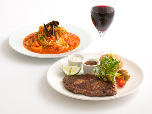 テラス席だけでなく、全面ガラス張りの店内からもベイエリアが一望できるというカフェレストラン。昼、夜ともに、景色を楽しみながらの食事は、自然とテンションもUP!パスタ、グリルなど、モダンアメリカン料理のメニューで、気どらないディナーが楽しめるのもうれしいポイントです。