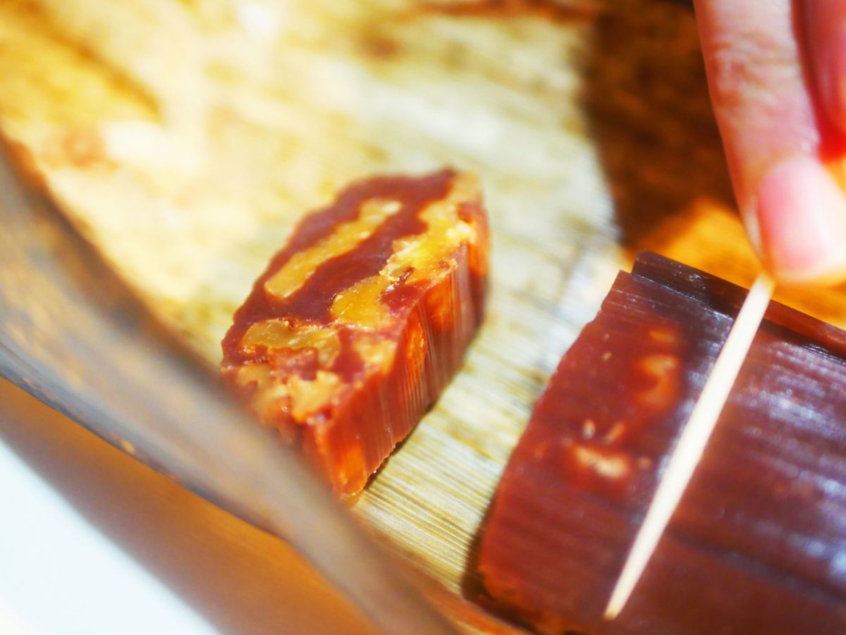 「月よみ山路」は、大粒の栗がごろごろ入った「栗むし羊羹(750円)」と、くるみ入りの香ばしい「比咩くるみ(750円)」の2種類。どちらも竹の皮に包まれていて、封を開くと竹の香りがふわりと広がります。栗もくるみも餡から飛び出しそうなほどたっぷりと詰まっていて、とっても贅沢!少し形が不揃いなところにも、1本1本手作りされているあたたかみを感じます。