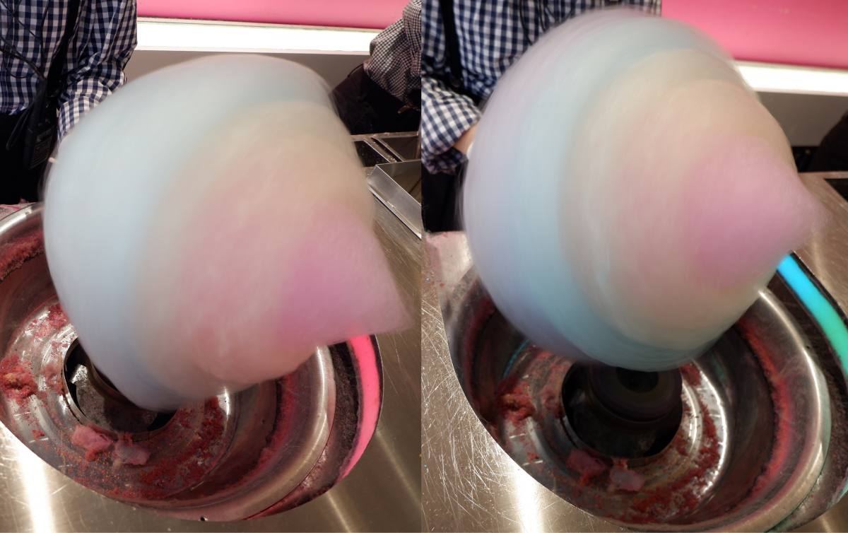 土台となるピンクの層をタマゴ型に整えたら、続いて2層目のきいろと、3層目のみどり…。あっという間に大きくなったわたあめからは、ほのかに甘い優しい香りがただよってきて、私たちのハートを一気にゆめかわいい世界へと連れていってくれます。