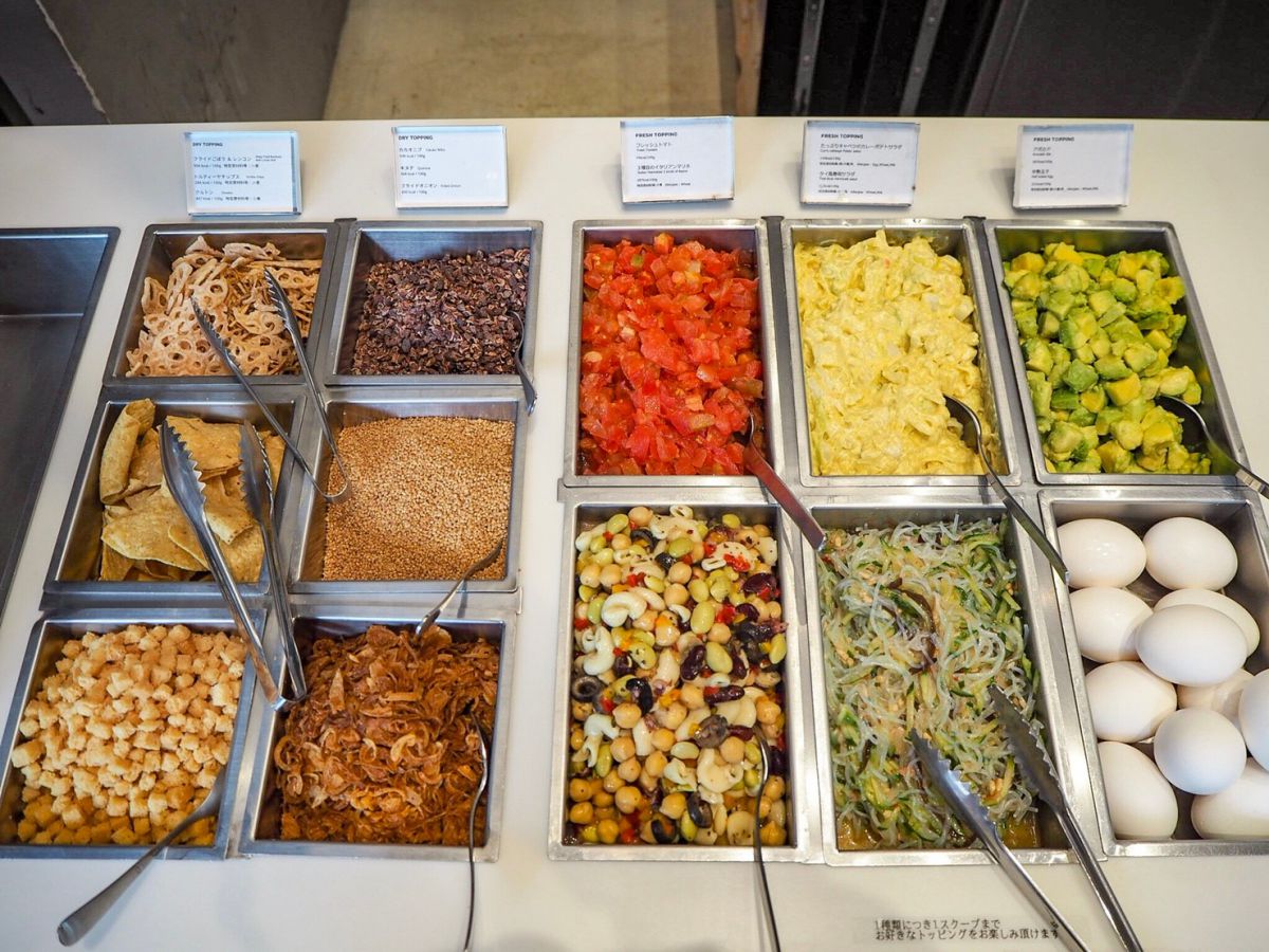 トッピングは、温泉たまごやポテトサラダから、女性にうれしいアボカドやスーパーフードのキヌアまで全12種類。たくさんの種類があるので、しばらく悩んでしまいそう。1種類につきワンスプーンまで、何種類でも乗せてOK。いつも食べないようなものに挑戦できるのもうれしいです。