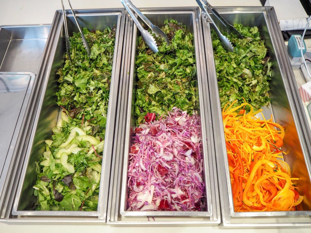 「サラダ」は、セロリやベビーリーフが入った農園ハーブ野菜(写真左)、紫キャベツやレッドオニオンが入ったスーパーベジ(真ん中)、人参やパプリカが入った緑黄色野菜(右)の3種類です。