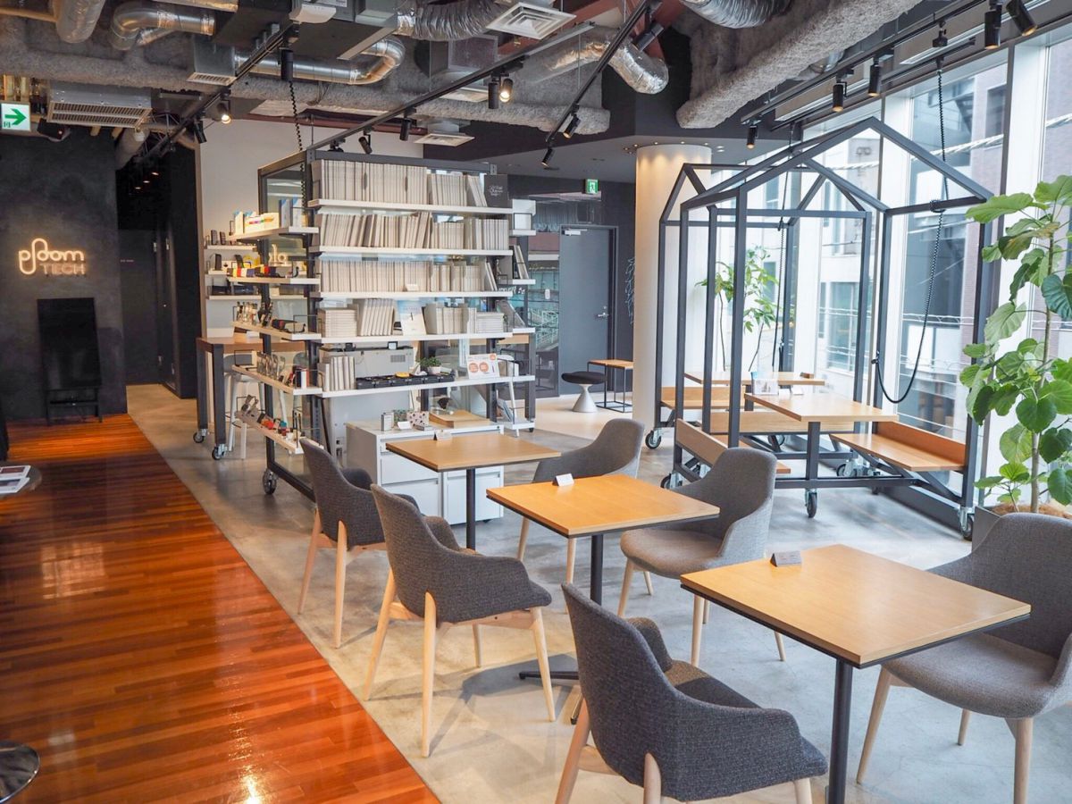 2階は、陽の光がやさしく差し込む広々とした空間で、コピー機やフリーWi-Fiなども使えます。静かに食事をしたい人だけでなくパソコンを持ち込んで作業をする人も多いとか。また店内は「No Smoking, PlomTECH Only」のスタイルで、全席PloomTECHのみ使用できます。