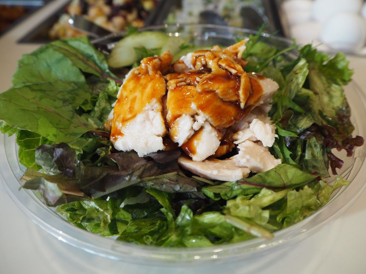 今回は、大麦雑穀米に農園ハーブ野菜をのせて、メインには鶏むね肉のテリヤキを選びました。これが基本となるDONBURIです。それを店員さんから受け取ったら、次はお待ちかねのトッピングの工程!